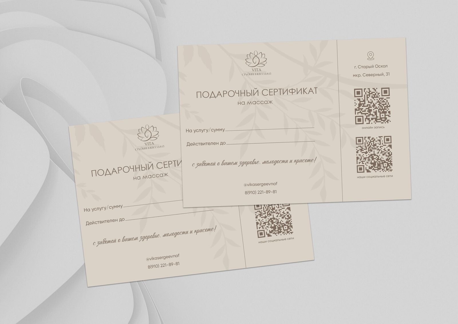 Приглашаем в студию массажа VITA - место, где работают люди, которые хорошо знают, как ценна естественная красота, и виртуозно умеют ее создавать и поддерживать. Каждый из нас ежедневно подвергается воздействию большого количества угнетающих факторов: грязный воздух, стрессы и нарушения режима питания, недостаток сна и хроническая усталость... Все это не может не отражаться на внешности, и не всегда косметические средства помогают исправить положение. В студии массажа VITA вам помогут восстановить здоровье и засиять естественной красотой!